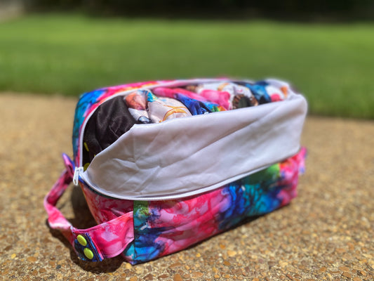 Our diaper pods are double lined with TPU & have 2 straps. They fit 6-8 stuffed diapers comfortably.